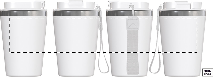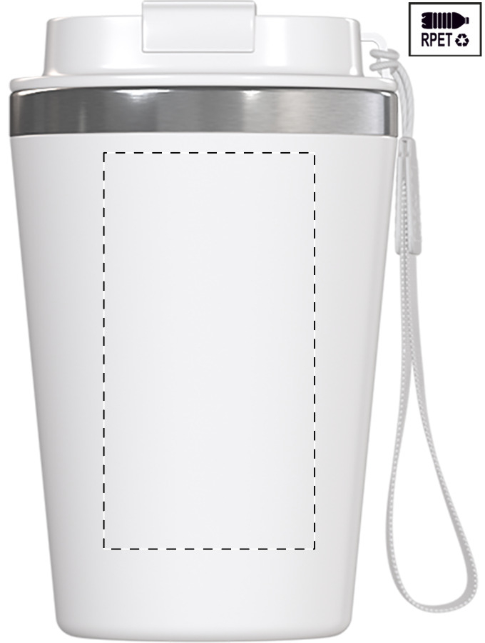 Bicchiere termico a doppia parete in acciaio riciclato da 350ml., con esterno e coperchio erogatore in plastica PP. Completo di laccetto in RPET.