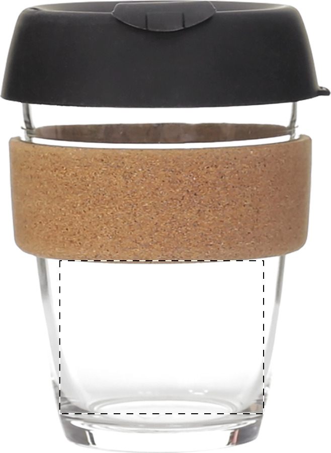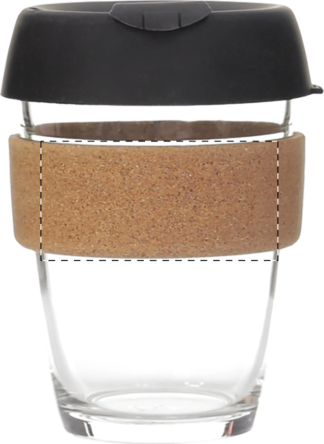 Tazza da asporto in vetro borosilicato monoparete con fascia in sughero naturale e coperchio in silicone, 350 ml.