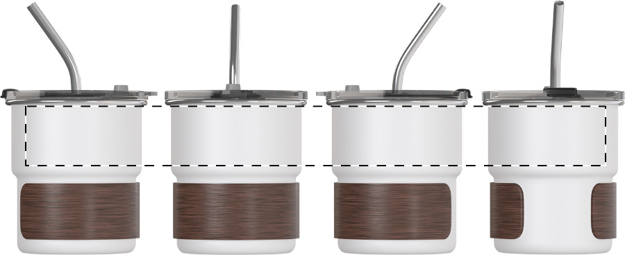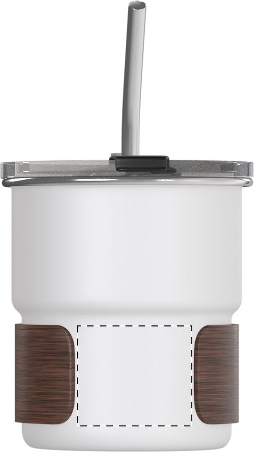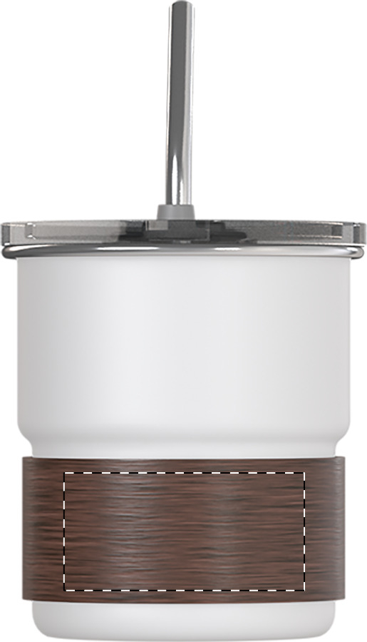 Bicchiere in acciaio riciclato a parete singola da 260ml con presa in legno di noce, coperchio in plastica e cannuccia in acciaio riciclato.