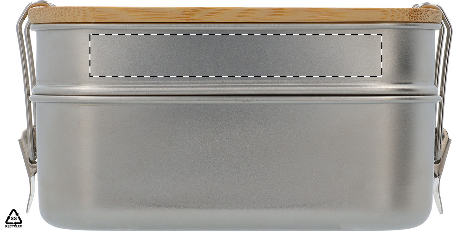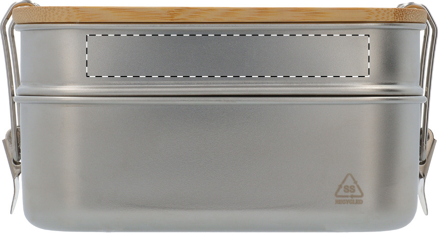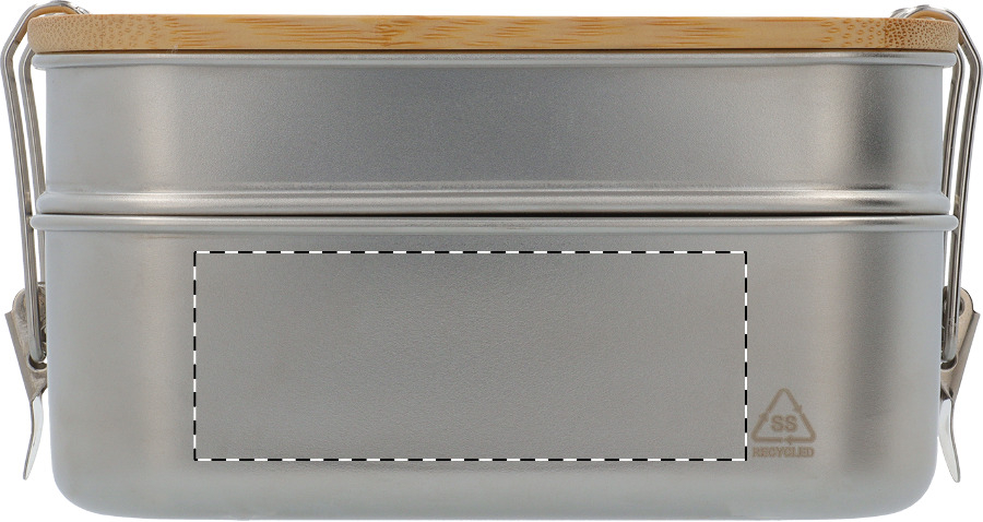 Contenitore per il pranzo in acciaio inox riciclato con coperchio in bambù e chiusura di sicurezza a fibbia. Dispone di 2 scomparti con capacità di 340 e 600 ml.