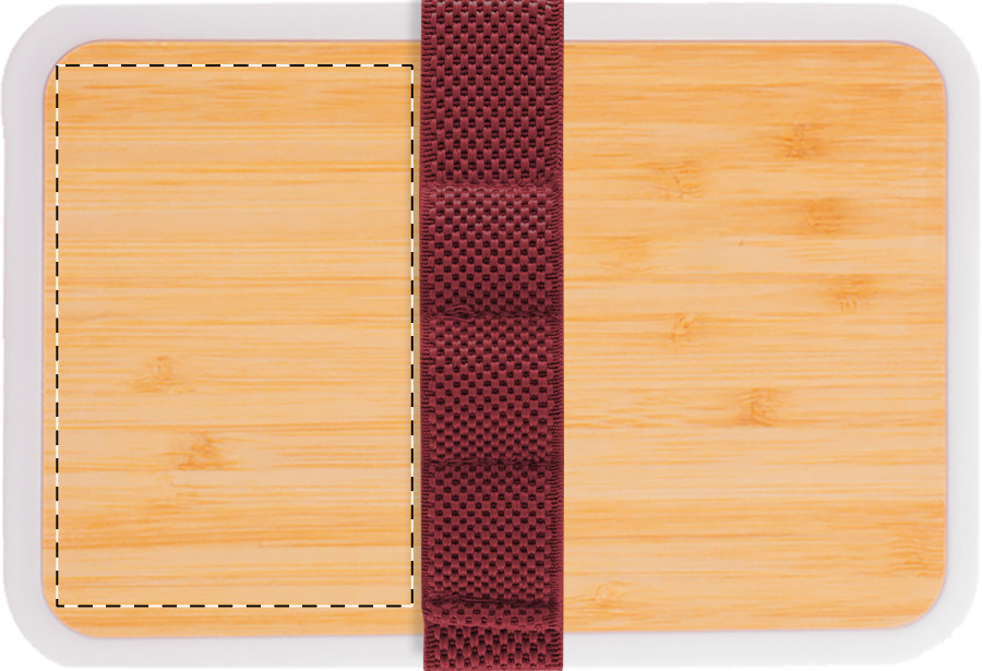 Contenitore per il pranzo in plastica PP riciclata con coperchio in bambù, set di posate (coltello e forchetta) e fascia elastica di chiusura. 500 ml.