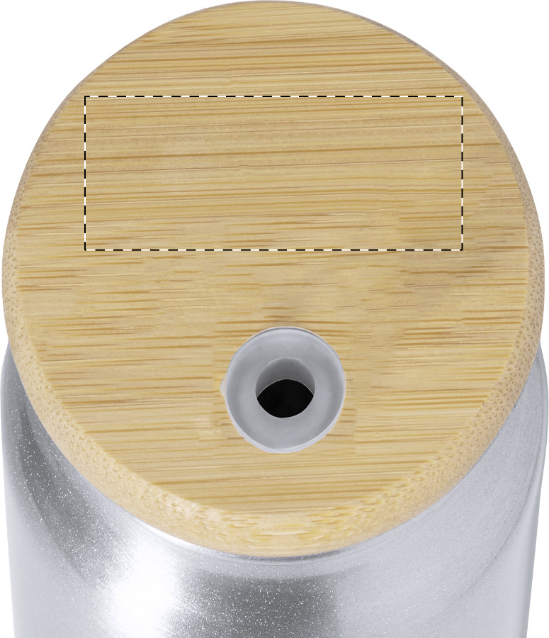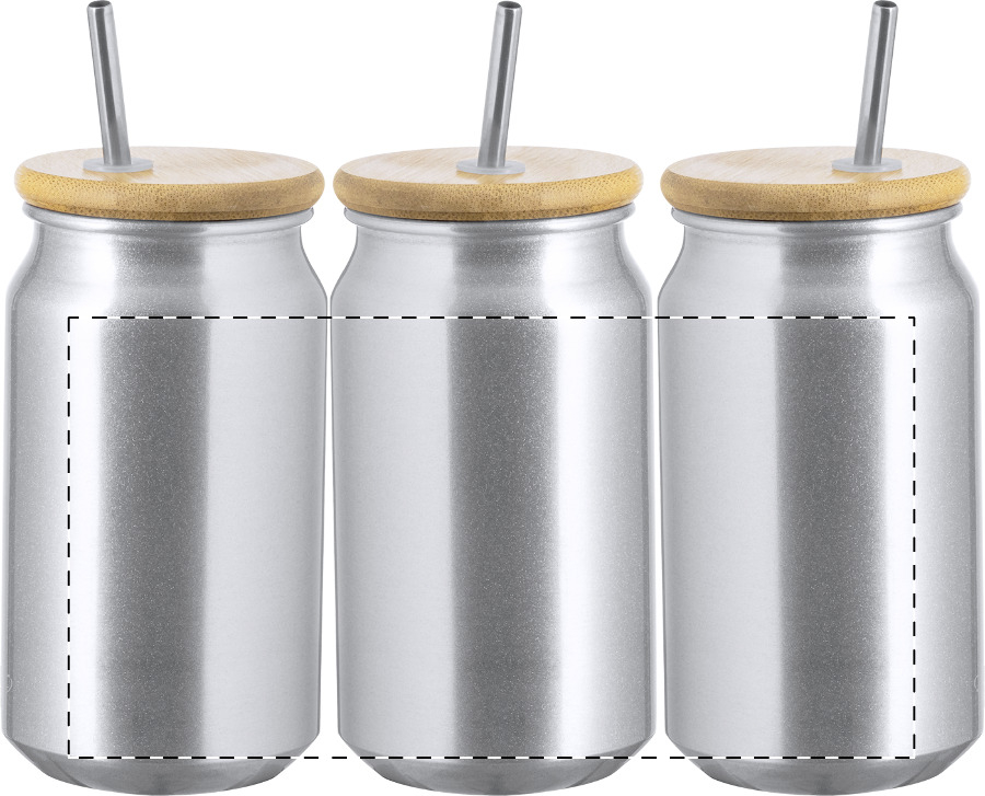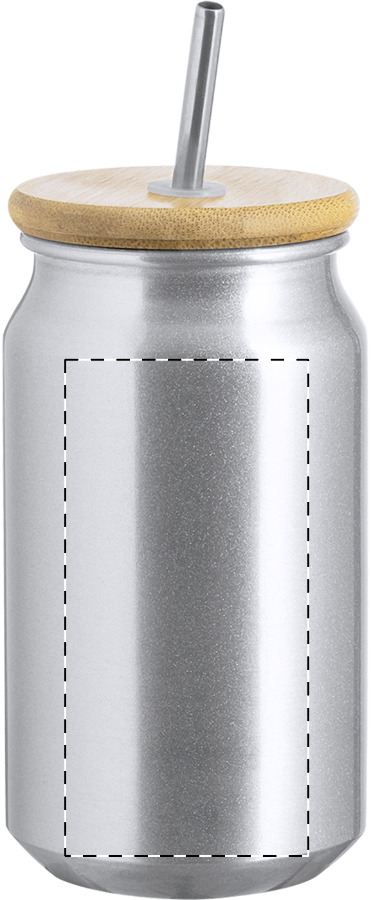 Tazza barattolo da 430 ml. in alluminio riciclato con coperchio in bambù e cannuccia in acciaio inossidabile. In scatola di cartoncino kraft.