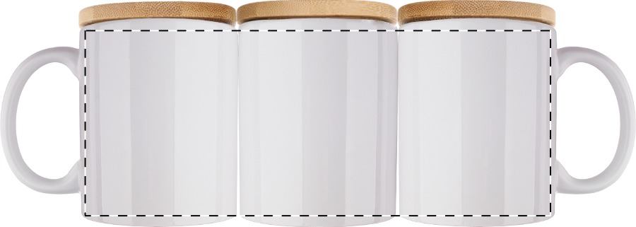Tazza in ceramica bianca da 300ml. per stampa in sublimazione, lavabile in lavastoviglie e coperchio in bambù. Confezione in scatola di cartoncino bianco.