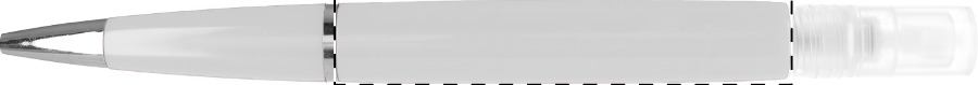 Penna a sfera in plastica con refill blu e spray igienizzante sulla parte superiore. Capacità: 3 ml. Fornita senza liquido disinfettante.