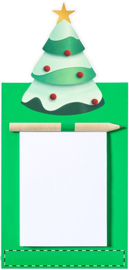 Blocco appunti su supporto magnetico con 40 fogli bianchi e decorazione a forma d'albero di Natale sulla parte superiore. Mini matita di legno inclusa.