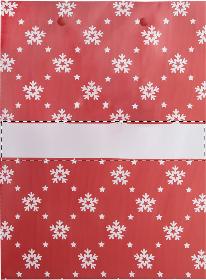 Sacchetto regalo in carta laminata opaca con design Natalizio, area di stampa bianca ed etichetta regalo.