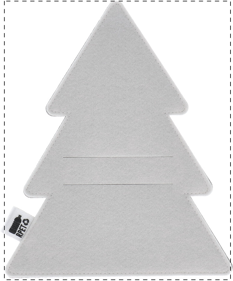 Portaposate in feltro RPET a forma di albero di Natale, personalizzabile sul lato anteriore con stampa a colori ed etichetta RPET. Il costo comprende la stampa in sublimazione. MOQ: 50 pezzi.
