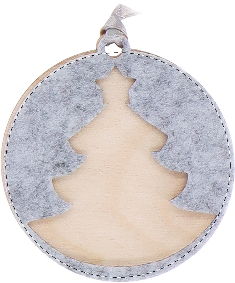 Ornamento per albero di Natale in feltro RPET a doppio strato e compensato di betulla, con nastro argentato e disegno natalizio fustellato sullo strato superiore. Il costo comprende la stampa a LED UV sullo strato inferiore. MOQ: 100 pezzi.