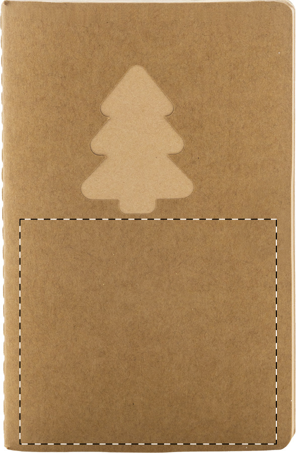 Quaderno formato A6, copertina in carta kraft riciclata con albero di Natale fustellato e 60 fogli in carta kraft riciclata.