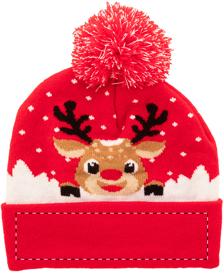 Cappello invernale in acrilico lavorato a maglia con decorazione natalizia e pompon.
