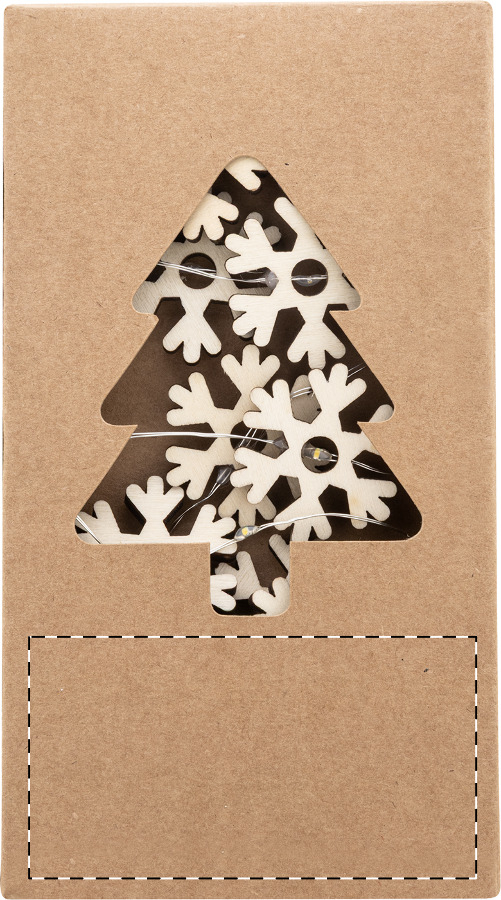 Decorazione natalizia luminosa con 20 luci LED a forma di fiocco di neve in legno. Funziona con 2 batterie AA (non fornite), pulsante ON/OFF posizionato sulla custodia delle batterie e confezione in scatola di cartoncino kraft.