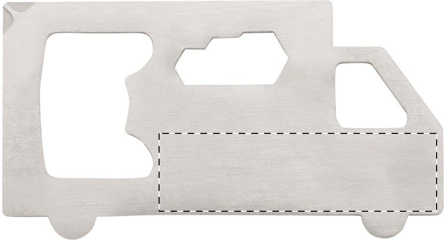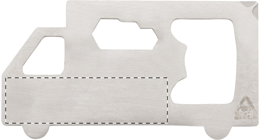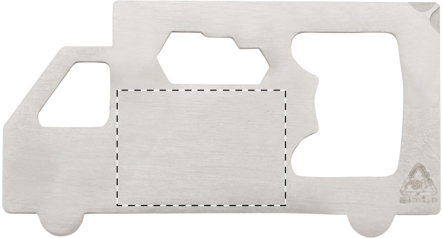 Multi utensile in acciaio inox riciclato a forma di camion con apribottiglie, cacciavite a croce e 3 chiavi piatte.