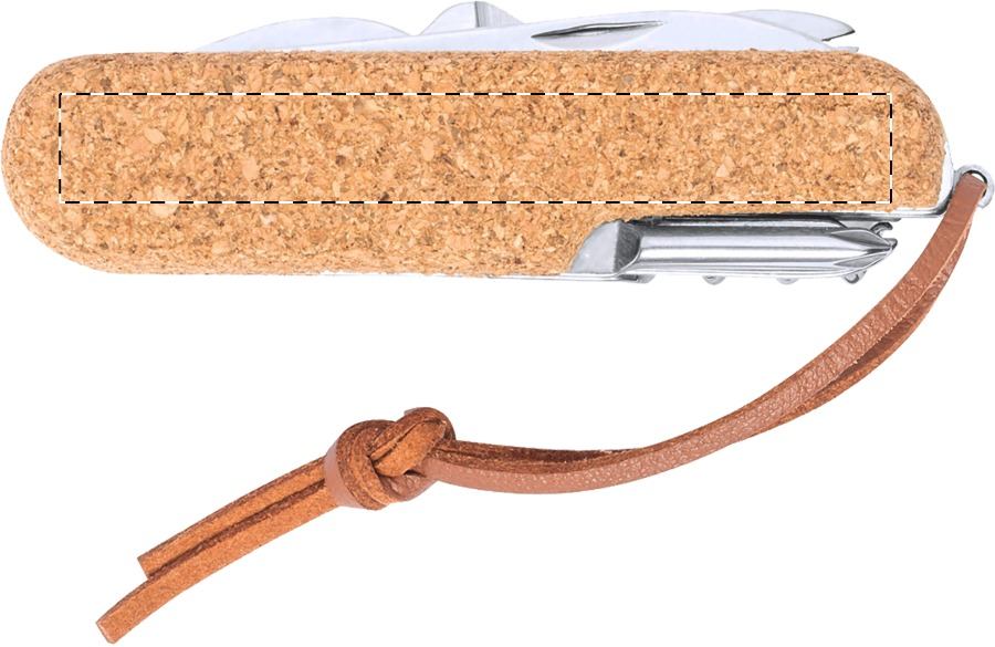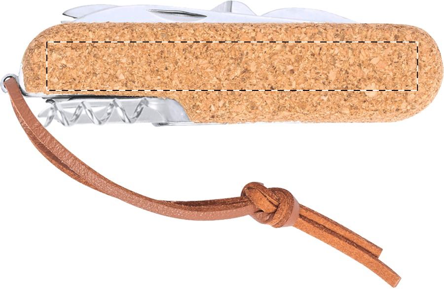 Coltellino tascabile multiuso in acciaio con 9 funzioni, manico in sughero naturale e cordoncino in pelle PU.
