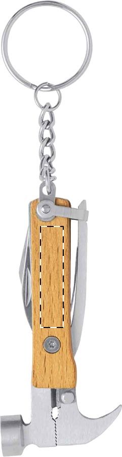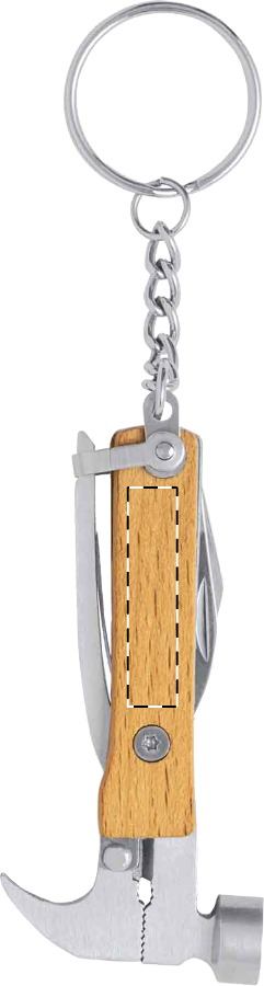 Utensile multifunzione in acciaio inox con manico in legno e 7 funzioni. Con portachiavi in metallo.