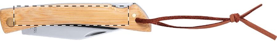 Coltello tascabile in acciaio con manico in bambù, cordoncino in pelle PU e chiusura di sicurezza.