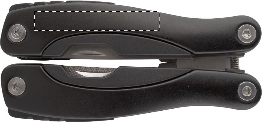 Pinza multiuso in acciaio inox con 8 funzioni ed impugnatura in alluminio, in scatola regalo di cartoncino nero.