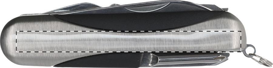 Coltello tascabile in metallo con 11 funzioni ed inserto in plastica.