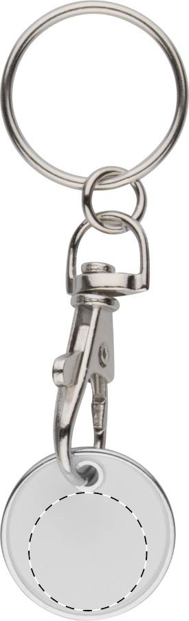 Portachiavi in metallo con gettone per carrello della spesa. Un lato del gettone è colorato mentre su l'altro è inciso un carrello della spesa. Dimensioni della moneta: ø23×1,7 mm.