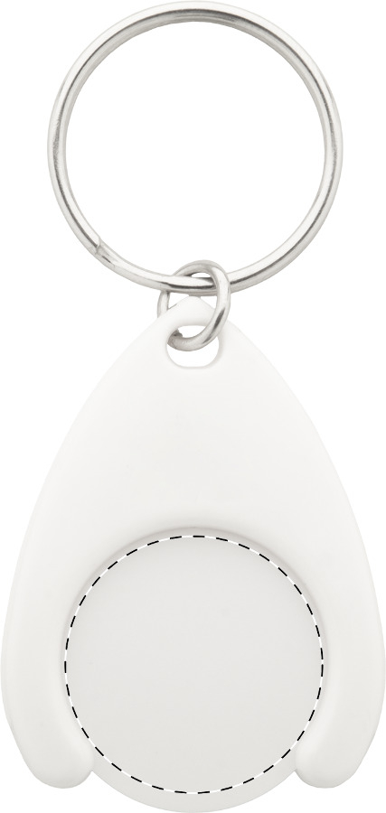 Portachiavi in plastica ABS e PS riciclata con moneta per il carrello della spesa ed anello in metallo. Dimensione moneta: ø24×2 mm.
