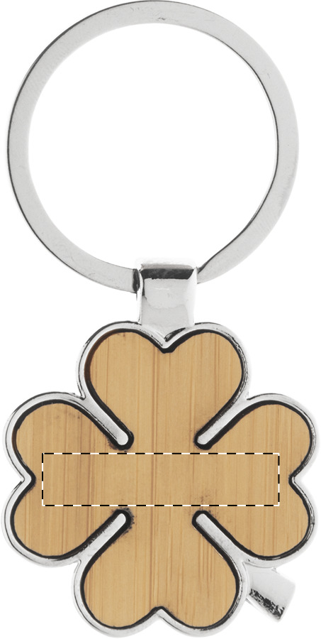 Portachiavi in metallo a forma di quadrifoglio con inserto in bambù. Fornito in scatola di cartoncino kraft.