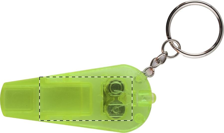 Fischietto in plastica trasparente colorata con mini torcia elettrica e portachiavi. Con batteria a bottone.