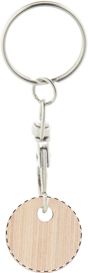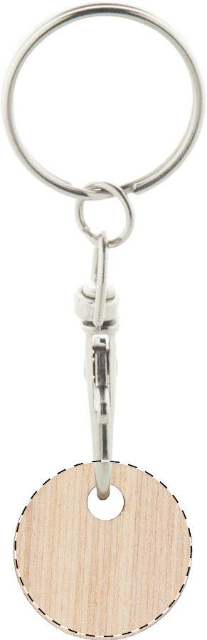 Portachiavi a moschettone in metallo con gettone in compensato per carrello della spesa personalizzabile con grafica a colori. Il costo comprende la stampa UV LED su un lato. Dimensioni della moneta: ø23×2 mm. MOQ: 200 pezzi.