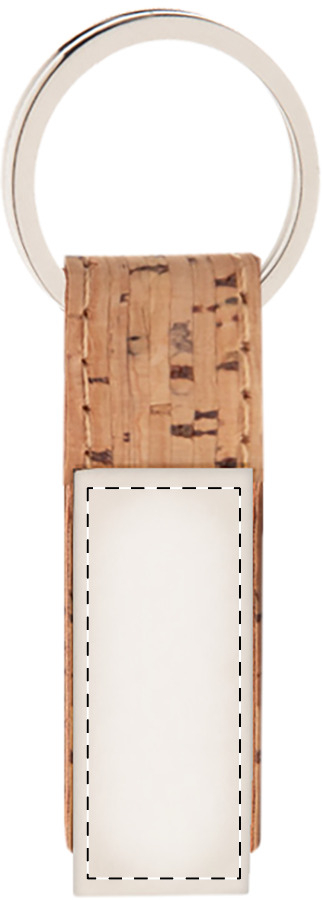 Portachiavi rettangolare in metallo con sughero naturale e cinturino in pelle PU. In scatola di cartoncino kraft.
