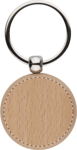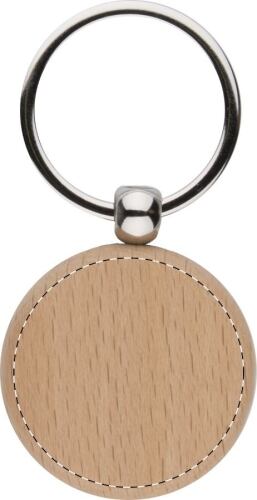 Portachiavi in legno di forma rotonda con anello in metallo.