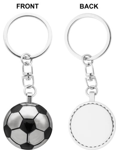 Portachiavi in metallo a forma di pallone da calcio semisferico. Fornito in scatolina nera.