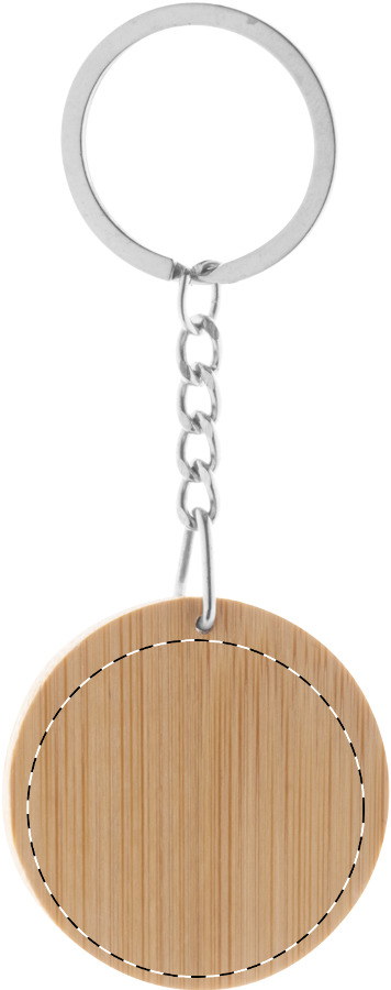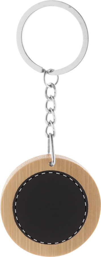 Portachiavi in bambù con piastra in acciaio inox dal rivestimento gommato speciale per incisione laser a specchio ed anello in metallo.