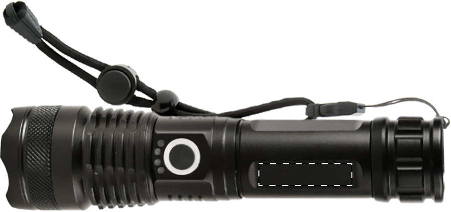 Torcia in alluminio con batteria ricaricabile USB integrata (1500 mAh) e cinturino per il trasporto. Dispone di luce COB ad alta potenza zoomabile. Modalità di luce intensa, media, bassa e lampeggiante. Fornita con cavo di ricarica USB.