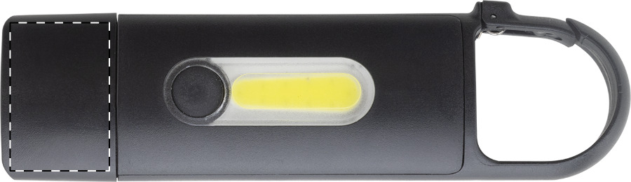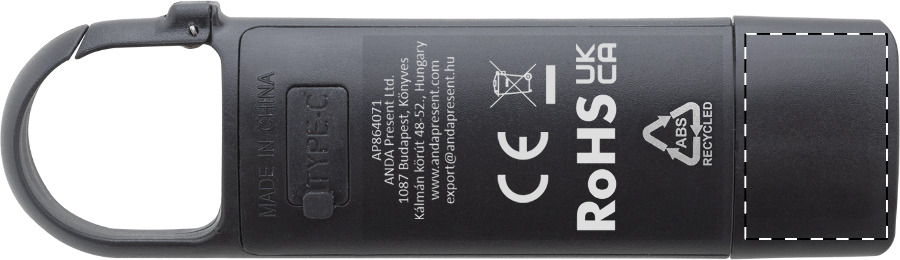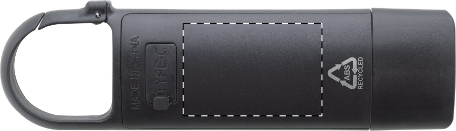 Mini torcia in ABS riciclato con batteria ricaricabile USB integrata (200 mAh), moschettone, 3 modalitàdi luminosità, luce COB sulla parte frontale e illuminatore COB sul lato. Cavo di ricarica USB incluso.