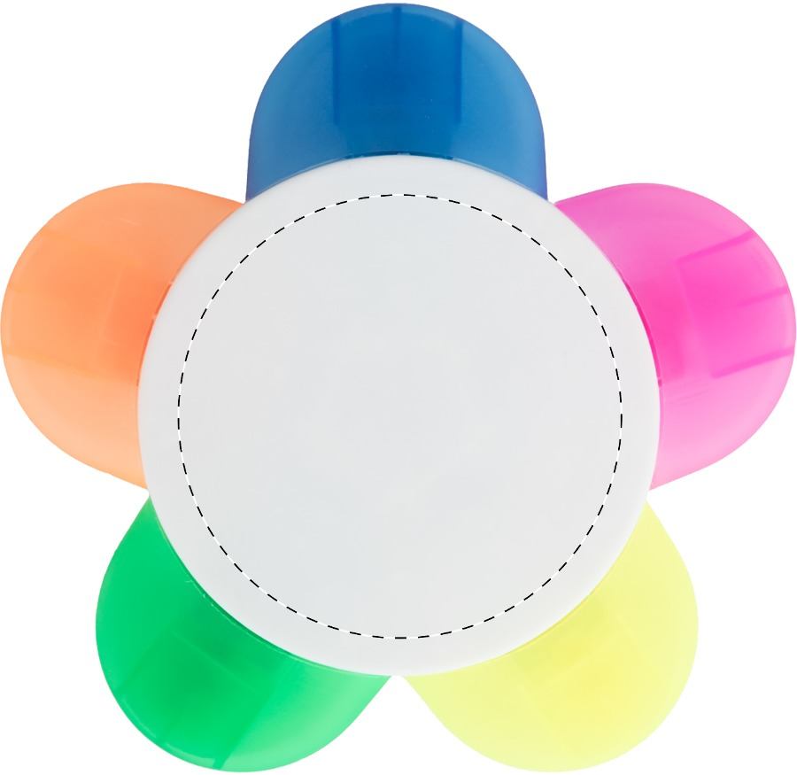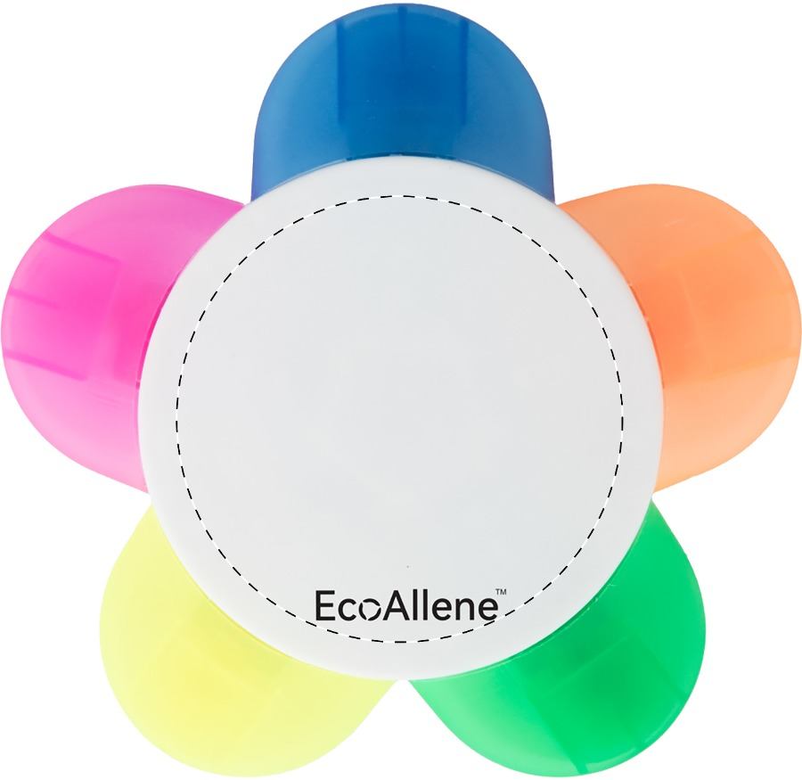 Evidenziatore in plastica riciclata EcoAllene® a forma di fiore con 5 colori. EcoAllene® è un materiale nuovo e innovativo derivato dal riciclo di contenitori per bevande.