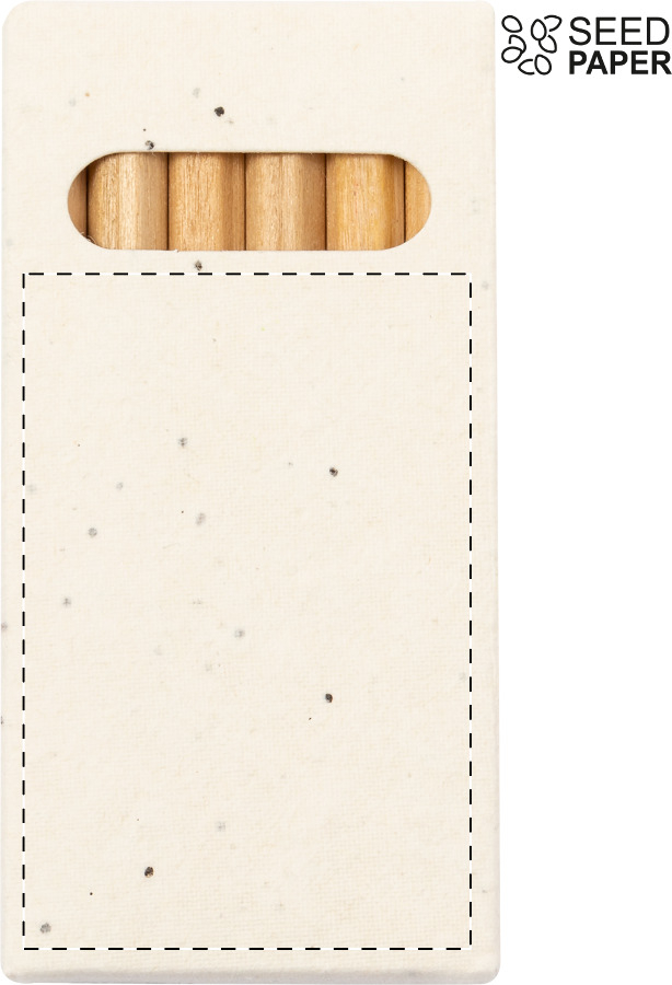 Set di 6 matite colorate in legno in una confezione realizzata con carta di semi. La scatola in carta di semi contiene semi di petunia in colori assortiti, che possono essere piantati successivamente all'uso.
