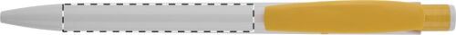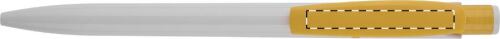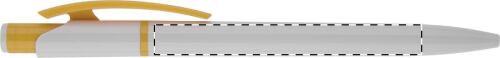Penna a sfera in plastica con corpo bianco e clip colorata. Consegnato con refill blu.