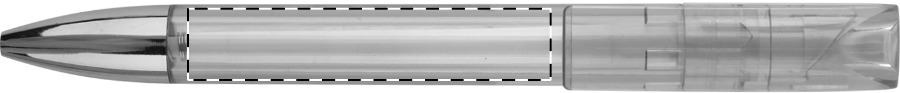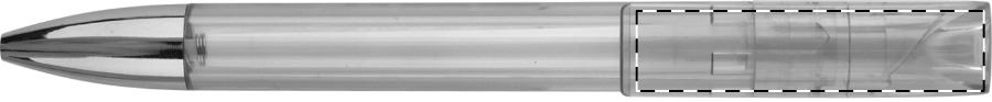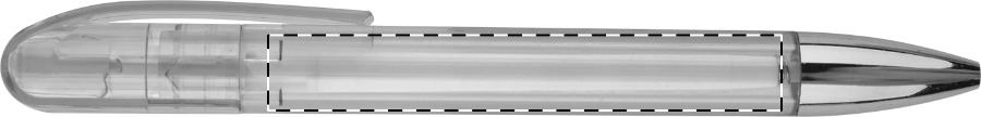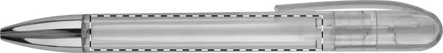 Penna a sfera in plastica di colore trasparente, con puntale cromato e refill blu.