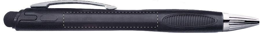 Penna a sfera in plastica e gommino capacitivo per touch screen con clip in metallo. Con 1 LED nel corpo della penna per personalizzazione ad incisione. Fornita con batteria a bottone e refill blu.