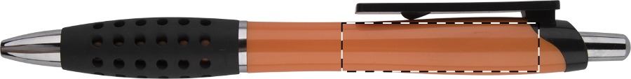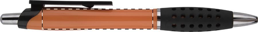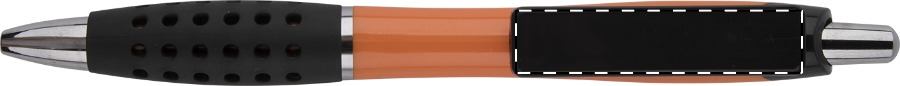 Penna a sfera in plastica con impugnatura in gomma, la clip è personalizzabile con etichetta resinata. Fornita con refill blu.