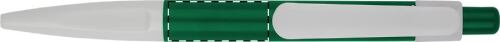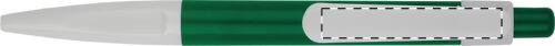 Penna a sfera in plastica con clip piatta, impugnatura rettangolare e refill blu.