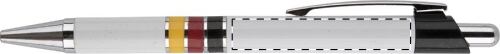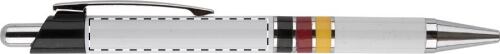 Penna a sfera in plastica con corpo bianco, clip cromo e anelli colorati. Refill blu.