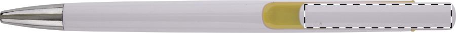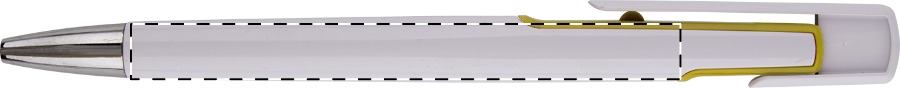Penna a sfera in plastica bianca con particolari colorati e puntale cromato. Fornita con refill blu.