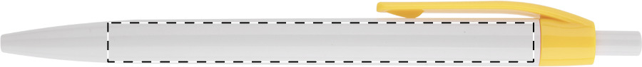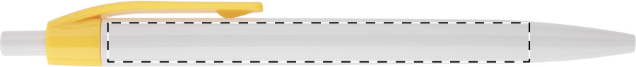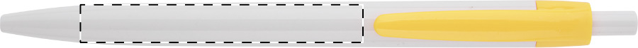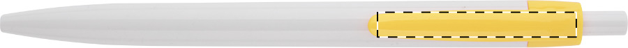 Penna a sfera in plastica con fusto bianco e clip colorata. Fornita con refill blu.