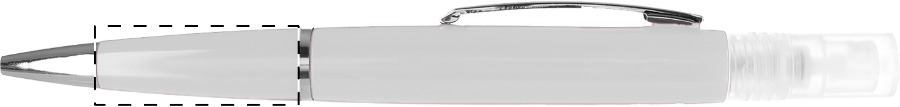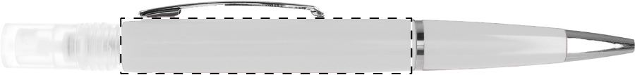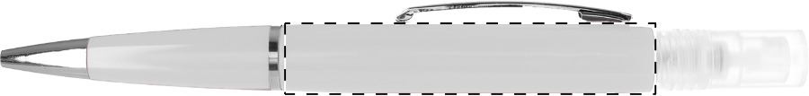 Penna a sfera in plastica con refill blu e spray igienizzante sulla parte superiore. Capacità: 3 ml. Fornita senza liquido disinfettante.