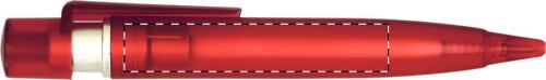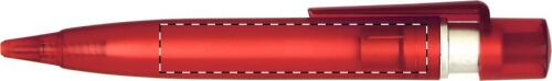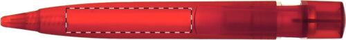 Penna in plastica trasparente colorata, con clip maggiorata per la personalizzazione e decorazione argentata. Refill blu.