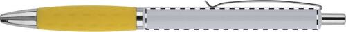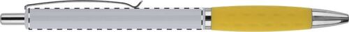 Penna a sfera in plastica con impugnatura in gomma colorata, clip e puntale in metallo. Fornita con refill blu.