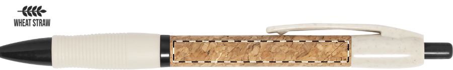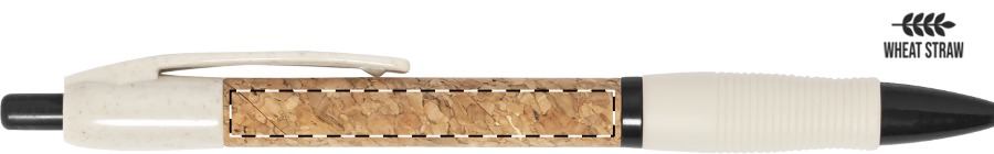 Penna a sfera con refill blu, in ecologica plastica a base di paglia di grano con fusto rivestito in sughero naturale ed impugnatura in gomma.