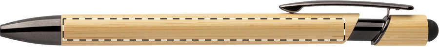 Penna a sfera in bambù con refill blu, dettagli metallici lucidi e pennino capacitivo in colore coordinato.