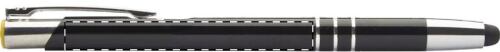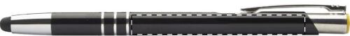 Penna a sfera in alluminio con gommino capacitivo per touch screen e rivestimento speciale che permette la personalizzazione ad incisione, evidenziando il fondo in colore coordinato al tappino. Fornita con refill blu.