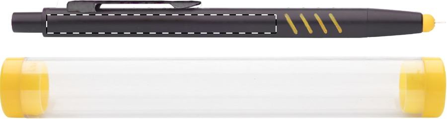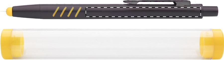 Penna a sfera in alluminio e gommino capacitivo per touch screen con grip e punta in gomma colorata. Rivestimento speciale che permette la personalizzazione ad incisione, evidenziando il fondo in colore coordinato alla punta. Fornita in astuccio tubolare di plastica trasparente, tappi di colore coordinato e refill blu.