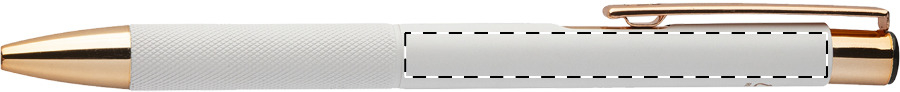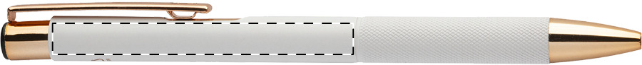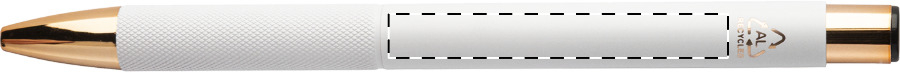 Penna a sfera in alluminio riciclato con corpo in finitura opaca, impugnatura testurizzata, dettagli in color oro rosa e refill blu. Lo speciale rivestimento permette incisioni a laser a specchio nel colore oro rosa.